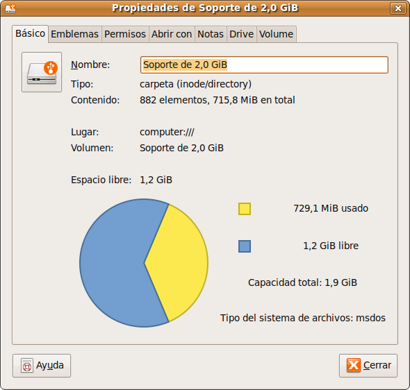 También puede comprobarlo de otro modo. Vaya al menú Lugares → Equipo. Una vez allí haga clic con el botón derecho del ratón sobre el dispositivo que desee, ya sea un disco duro, partición de disco o soporte extraíble, y en el menú contextual seleccione Propiedades.