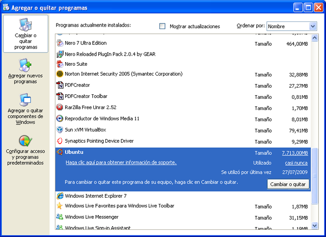 Vaya al menú Inicio→Configuración→Panel de Control. Una vez allí haga doble clic sobre Agregar o quitar programas. En la lista de programas localice Ubuntu.