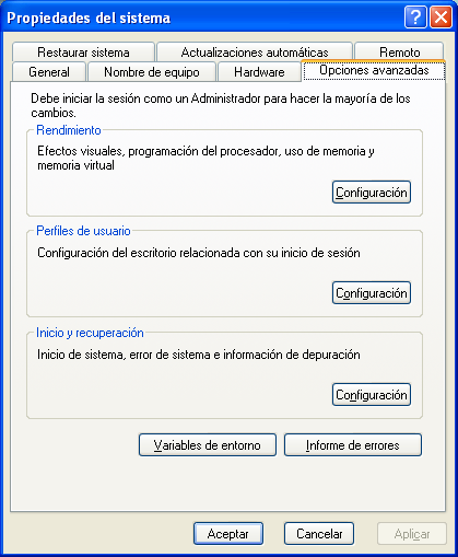 Haga clic con el botón derecho del ratón sobre el icono MiPc y en el menú emergente seleccione Propiedades. Una vez en la ventana de propiedades haga clic en la pestaña Opciones avanzadas