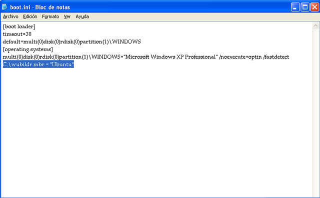 Una vez en el editor borre la línea C:|wubildr.mbr="Ubuntu"