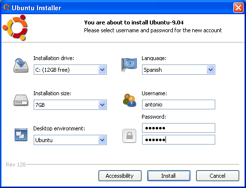 Pulse el botón Install inside Windows. Verá entonces la ventana de configuración de Wubi.