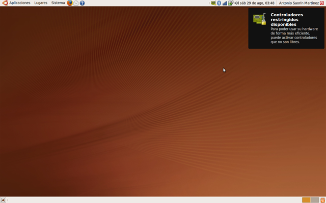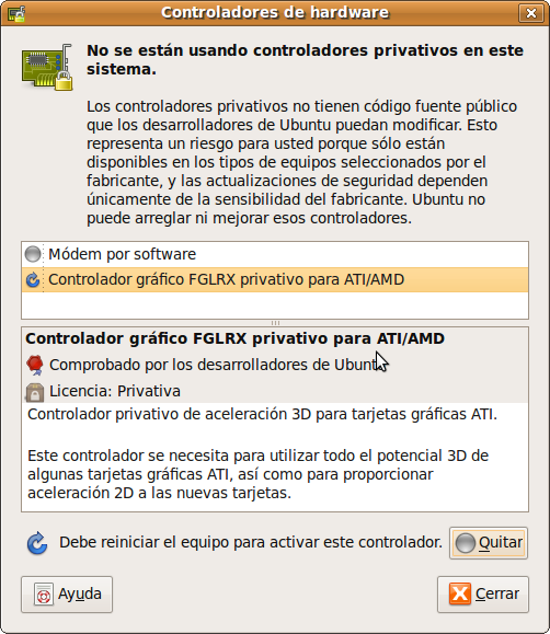 ¿Qué significa esto? En versiones anteriores Ubuntu instalaba los mejores controladores disponibles para el hardware detectado ya fueran éstos software libre o privativo. Esta forma de proceder del equipo de desarrollo de Ubuntu recibió duras críticas puesto que suponía mezclar software libre y no libre sin que el usuario fuera advertido de esta circunstancia. Por ello actualmente Ubuntu únicamente instala automáticamente controladores libres, es decir, aquellos que cumplen las condiciones de la licencia GPL. Pero varios fabricantes comienzan a proporcionar controladores para sus productos, éste es el caso por ejemplo de AMD y sus tarjetas gráficas ATI. Pero los distribuyen en forma de ejecutables sin proporcionar el código fuente. En muchos casos los controladores libres son suficientes para que su equipo funcione correctamente. En esos casos los controladores restringidos suelen ofrecer mejoras en el funcionamiento de los componentes. Finalmente habrá situaciones en que un dispositivo sólo sea utilizable si se usa el controlador privativo proporcionado por el fabricante. En cualquier momento usted puede comprobar qué tipo de controladores usa su sistema. Para ello vaya al menú Sistema→ Administración→Controladores de hardware