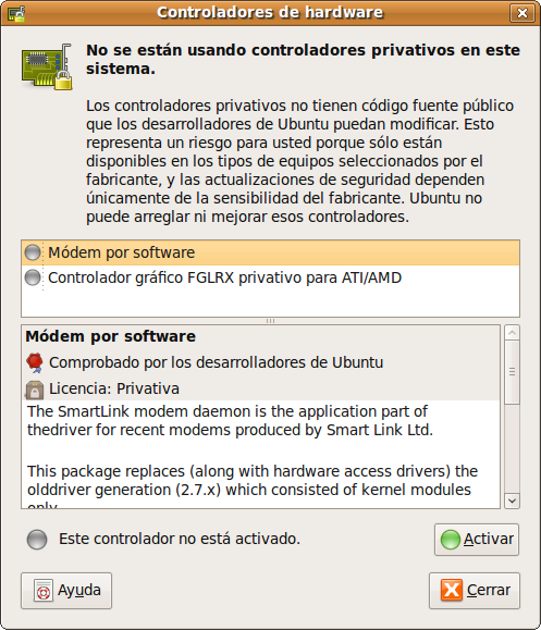 Se le informará de si su sistema está usando o no controladores privativos y se le ofrecerá la posibilidad de instalarlos si es que se encontró alguno. Si desea instalar uno de estos controladores selecciónelo de la lista y pulse el botón Activar.
