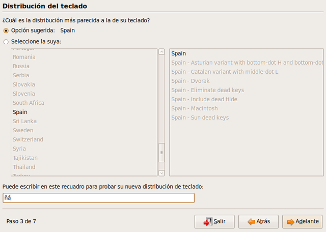 Se nos pregunta ahora por el tipo de teclado del que disponemos. Seleccionaremos el teclado "Español". Si queremos asegurarnos de que el teclado elegido es el correcto, situamos el puntero del ratón en el campo "Puede escribir en este recuadro para probar...", hacemos clic con el botón izquierdo del ratón y probamos a escribir algunos caracteres propios del teclado español, por ejemplo la "ñ".