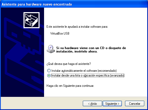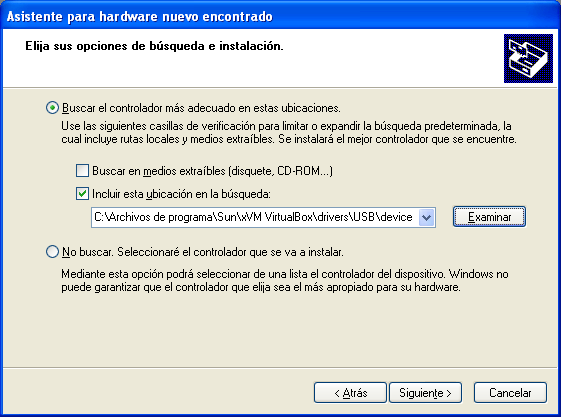 Ahora debemos indicar a Windows dónde encontrar el controlador para el nuevo dispositivo. Para ello hacemos clic en la casilla Incluir esta ubicación en la búsqueda y pulsamos el botón Examinar. En el explorador de ficheros vamos a C:\Archivos de programa\Sun\xVM VirtualBox\drivers\USB\device y pulsamos Aceptar. Finamente en la ventana del asistente pulsamos Siguiente.