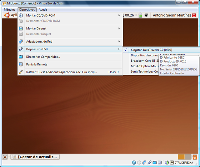 Ejecute VirtualBox, inicie la máquina virtual y espere hasta estar en el escritorio de Ubuntu. Conecte entonces la memoria USB al equipo. Vaya al menú de la máquina virtual Dispositivos USB y seleccione el que corresponda a su memoria USB (habitualmente será el primero de la lista, pero esto puede variar). En ese momento verá un mensaje en el área informativa de la barra inferior de Windows que le indica que se está instalando un nuevo controlador de dispositivo. En concreto se instala el controlador virtual Vbox USB.
