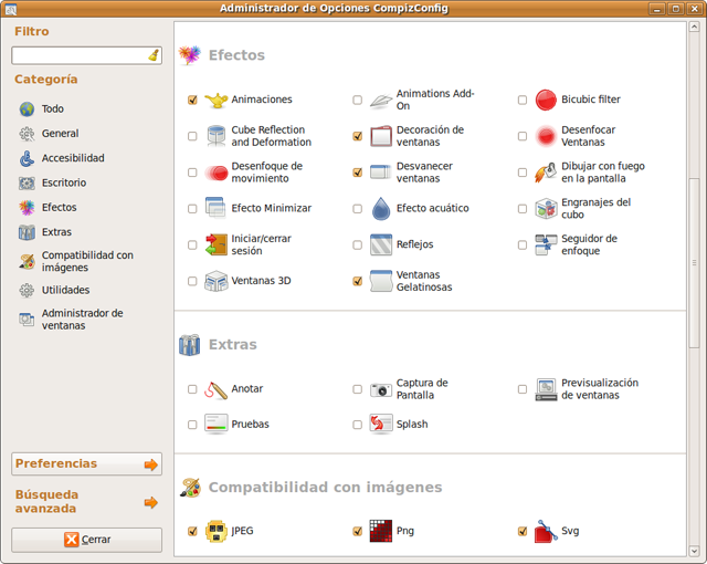 Mediante este gestor, podrá activar y configurar cualquier efecto para personalizar el aspecto y comportamiento de su escritorio.