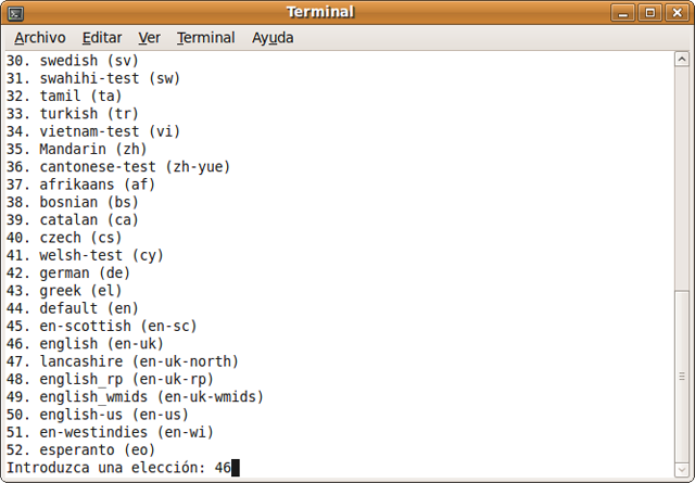 Tras pulsar la tecla Intro, obtendrá una terminal desde la que podrá configurar el idoma desde una lista. Si desea que el sistema lea las palabras que usted teclea, conteste si a la pregunta ¿Activar eco por palabras? De esta forma, puede ir estableciendo las preferencias para Orca, en cuanto al tipo de teclado o la salida Braille, si dispone de un dispositivo BrlTTY compatible.