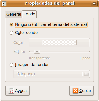 El aspecto del panel lo podemos cambiar en el misma ventana de Propiedades pero ahora en la pestaña Fondo: