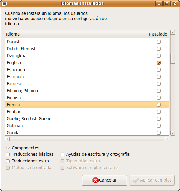 En la parte inferior, observará un botón para Instalar/eliminar idiomas. Al pulsar sobre él obtendrá una ventana con la lista de idiomas disponibles y una casilla de verificación a la derecha de cada uno de ellos. Marque aquellos que desee, así como los componenentes disponibles para cada uno de los seleccionados. Finalmente, pulse sobre Aplicar cambios. Proporcione la contraseña de administración cuando se la solicite y comenzará la descarga de los paquetes necesarios desde Internet.