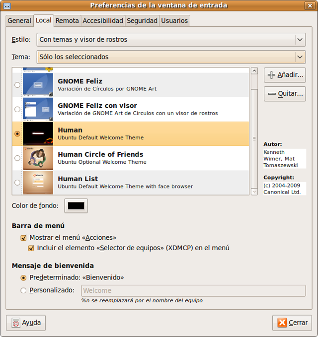Recuerde que puede instalar nuevos temas. En http://art.gnome.org/ y http://gnome-look.org/ puede encontrar multitud de ellos, busque allí Login Manager o GDM Themes.