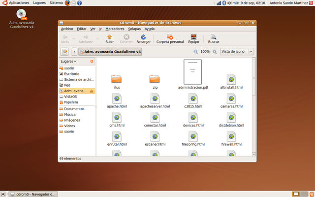 CD/DVD. Introducimos el medio en la unidad lectora, éste será reconocido por el sistema, aparecerá su icono correspondiente en el escritorio y se abrirá una ventana de Nautilus mostrando sus contenidos. En todo caso siempre podemos acceder haciendo una doble pulsación con el botón izquierdo en el icono del escritorio. Alternativamente vamos al menú Lugares - > Equipo o pulsamos el botón Equipo del administrador de archivos.