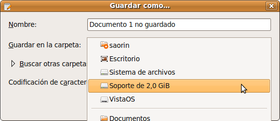Una vez hecho esto el disquete quedará incorporado al sistema de ficheros. Si queremos guardar un archivo desde cualquier aplicación y una vez haya aparecido la ventana de diálogo Guardar como... seleccionaremos floppy de la lista desplegable "Guardar en una carpeta".