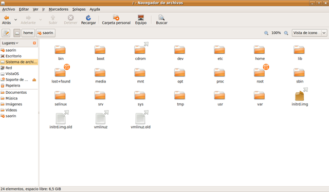 Si desde Nautilus pulsamos en el panel lateral el acceso al sistema de archivos veremos el árbol completo de directorios. En la barra de título de la ventana veremos el símbolo / indicando que estamos en la raíz del árbol. En GNU/Linux esta es la única raíz, no existen letras de unidad para diferentes dispositivos como sí ocurre en otros sistemas, todo (CD-ROM, disquete, memoria USB, etc.) cuelga de aquí.