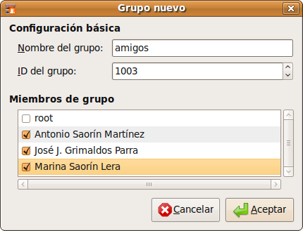 En la ventana de diálogo escriba un nombre para el grupo, por ejemplo amigos. Bajo el epígrafe Miembros del grupo marque el usuario o usuarios que quiere que formen parte del grupo. Cuando haya terminado haga clic en Aceptar.