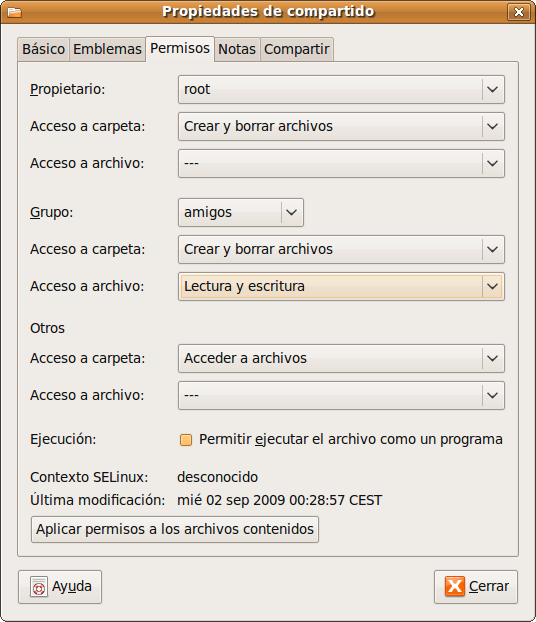 Abra la pestaña Permisos. En la lista desplegable Grupo del archivo elija el nombre del grupo que creó más arriba (en nuestro ejemplo, amigos).