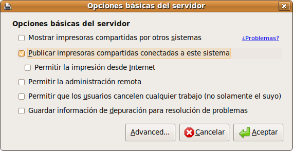 3. Marque la casilla Publicar impresoras compartidas conectadas a este sistema. Finalmente pulse Aceptar.