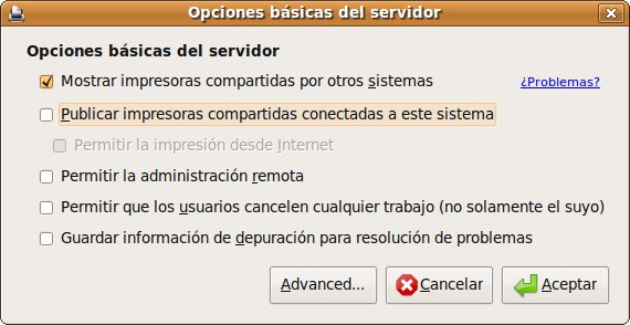3. Marque la casilla Mostrar impresoras compartidas por otros sistemas. Pulse Aceptar.