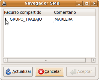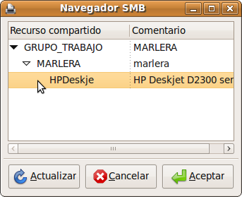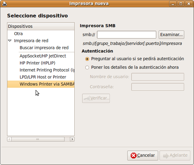 9. Si la impresora no se encuentra automáticamente puede escribir su localización manualmente en la casilla rotulada smb:// de este modo grupo_de_trabajo/servidor/impresora. Donde servidor es el nombre la máquina Windows a la que está físicamente conectada la impresora, grupo_de_trabajo es el grupo de trabajo al que pertenece ese equipo e impresora es el nombre que tiene la impresora en la máquina Windows.