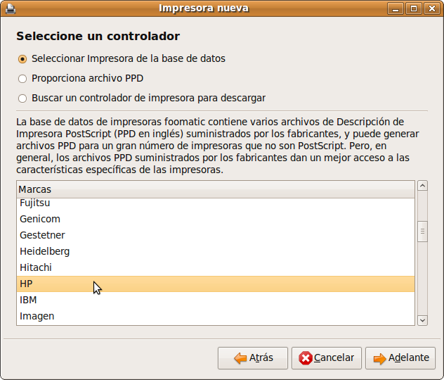 12. Verá ahora un listado de los modelos soportados, simplemente haga clic para seleccionar el suyo. Si su modelo de impresora no se encuentra listado pulse el botón Atrás y marque Buscar un controlador de impresora para descargar para permitir que Ubuntu descargue el controlador apropiado en caso de encontrarlo. También puede ser que usted tenga el archivo de controlador .ppd correspondiente a esa impresora. En ocasiones ese archivo está incluido en los drivers para Windows o se puede descargar directamente de la página del fabricante. Una vez hecho esto pulse Adelante.