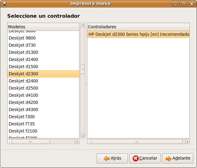 En ocasiones es posible que no encuentre exactamente el número del modelo de su impresora sino solamente la serie. Por ejemplo usted quiere instalar una impresora HP DeskJet D2360. En ese caso seleccione Deskjet d2300 puesto que ese controlador es válido para la serie completa.