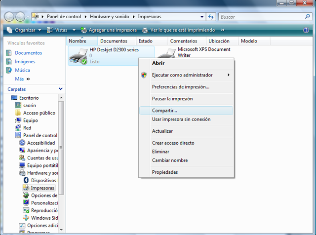 Para compartir una impresora en Vista haga lo siguiente: