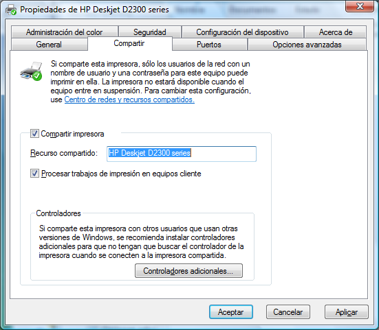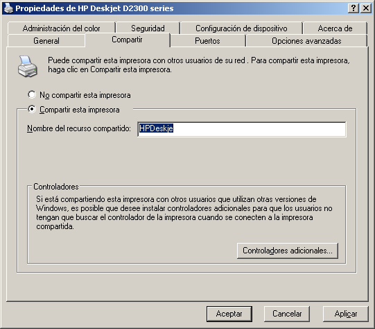 5. Finalmente pulse de nuevo Aceptar. De este modo la impresora está compartida y permitirá imprimir desde otros equipos de la red.