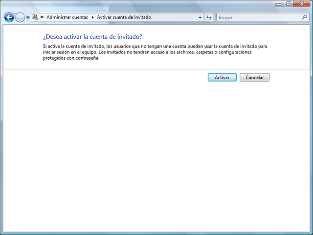Para habilitar la cuenta de invitado en Windows Vista haga lo siguiente: