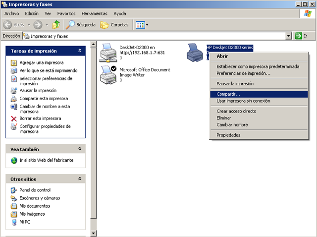 2. En la ventana que aparece haga clic con el botón derecho del ratón sobre la impresora que quiere compartir y en el menú emergente seleccione Compartir...
