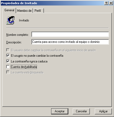 3. Para habilitarla haga doble clic sobre la entrada Invitado. En la ventana de diálogo desmarque la casilla Cuenta deshabilitada y pulse Aceptar.