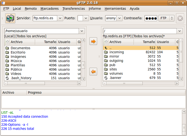 Una vez instalado gFTP lo encontraremos bajo el menú Aplicaciones -> Internet -> gFTP. En el campo servidor escribiremos: ftp.rediris.es. El campo nombre de usuario y contraseña lo podemos dejar en blanco ya que gFTP los añadirá automáticamente. A continuación pulsamos el icono Conectar/Desconectar en la parte superior izquierda. Se nos pedirá un nombre de usuario. No escriba nada simplemente pulse Conectar. Después de un tiempo que puede variar según el servidor y nuestra velocidad de acceso nos aparecerá una ventana como la siguiente: