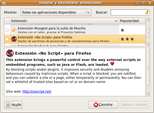 Si pulsamos sobre Obtener extensiones de Ubuntu, se nos abrirá un instalador propio para incluir extensiones auspiciadas por la distribución. En este caso la ventana está dividida en dos zonas, en la primera se listan todas las extensiones filtradas mediante el criterio establecido en Mostrar o según el término introducido en la caja de búsqueda y en la parte inferior una descripción, generalmente en inglés, de la extensión seleccionada. En cualquier caso, la instalación es prácticamente automática. A modo de ejemplo, trataremos de mostrar la instalación de una extensión que nos avisa de la existencia de mensajes nuevos en una cuenta de correo web, si tenemos alguna de este tipo.