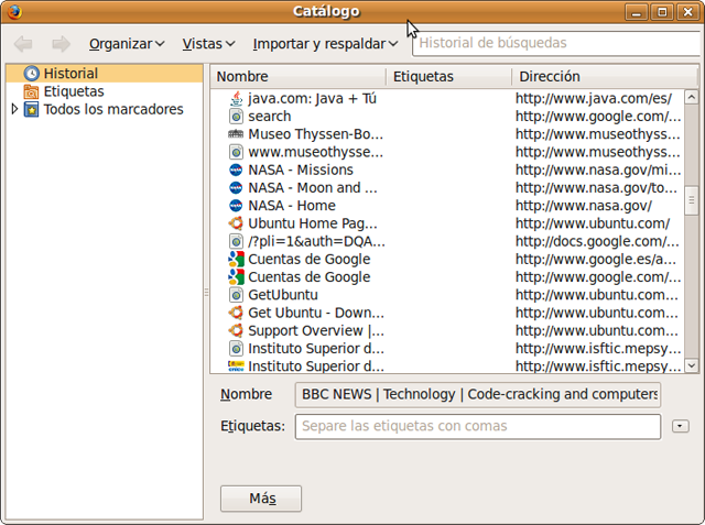 5. Para consultar alguna de las páginas que visitó en sesiones anteriores, abra el menú Historial y seleccione Mostrar todo el historial. También puede hacerlo con la combinación de teclas Ctrl + Mayúsc. + H. Obtendrá una ventana llamada Catálogo. En el panel lateral aparecerá una lista de entradas del histórico, junto a sus marcadores. Haga clic en cualquiera de ellas o pulse la flecha situada a la izquierda para desplegar las subentradas. En la parte central obtendrá la lista de páginas correspondiente. Para ir a una página concreta pulse en el enlace. Cuando quiera cerrar el historial use el menú Organizar -> Cerrar o bien utilice el botón en forma de aspa en la parte superior derecha de la ventana.