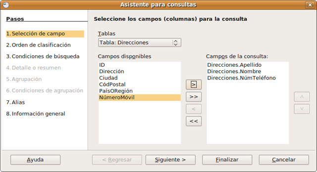 Selección de campo. Indicaremos los campos que se utilizarán para la consulta, descartando, por tanto, el resto de la información de la tabla.