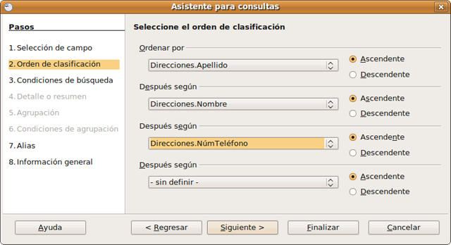 Orden de clasificación. Indicamos aquí el criterio que servirá para la clasificación y el orden en que se mostrarán, ascendente o descendente, los registros consultados.