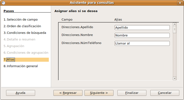 Alias. Si nos interesa sustituir en nombre del campo por alguna otra palabra en el resultado de la consulta.