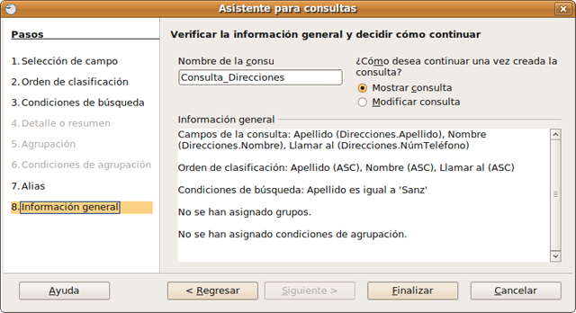 Información general. Es la última ventana del asistente y contiene un resumen de todos los pasos que hemos dado. Como en los casos anteriores podemos decidir si comenzar a trabajar con el formulario o abrirlo en la vista diseño para realizar algunos ajustes. Pondremos un nombre para almacenar esta consulta, dado que se pueden definir múltiples consultas de la misma base de datos para cubrir distintas necesidades de información. Comprobamos que todo es correcto y pulsamos en Finalizar.