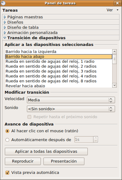 Utilizando el asistente añadimos efectos de transición entre diapositivas que se aplican al conjunto de la presentación. Sin embargo podemos cambiar estos efectos para una o varias diapositivas en particular.
