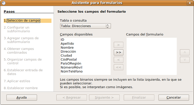 Selección de campo. Desde aquí seleccionaremos los campos que queremos que aparezcan en el formulario, normalmente serán todos, si necesitamos controlar todos los datos de cada registro, excepto el campo ID (campo de clave principal) que lo gestiona automáticamente la base.