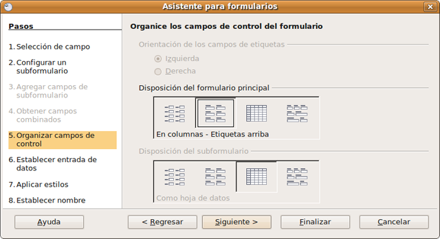 Organizar campos de control. Definimos aquí la forma en que se visualizará el formulario pudiendo ser en bloques, columnas, como hoja de datos, etc. Esta cuestión afecta únicamente a la presentación, no a la naturaleza de los datos.