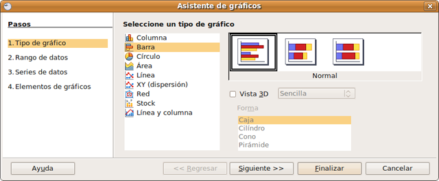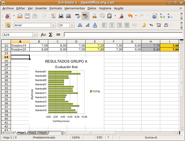 En el menú Insertar -> Gráfico, se inicia el Asistente para gráficos, donde estableceremos las condiciones generales del gráfico. No es necesaria demasiada precisión pues, una vez creado, podemos modificar cómodamente los ajustes. Hemos elegido un diagrama de barras horizontales con el objetivo de visualizar gráficamente la calificación total de nuestros alumnos.