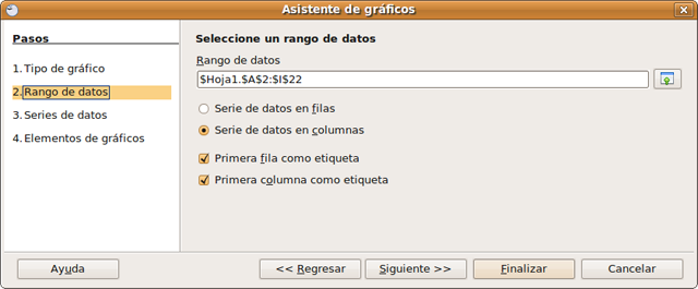 Comprobamos que el rango de datos se corresponde con nuestra tabla, es decir, desde A2 hasta I22 y pulsamos en el botón Siguiente.