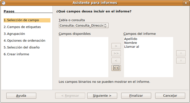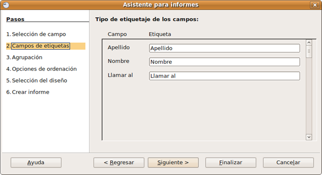 Etiquetaje de los campos. El nombre de los campos puede ser bastante críptico. Por ello puede especificar una etiqueta más legible para cada uno de ellos y será así como aparezcan en el informe. Es similar a los "alias" de las consultas.