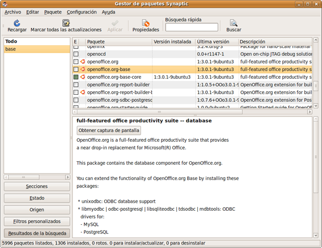 Accedemos al él mediante Sistema -> Administración -> Gestor de paquetes Synaptic, pulsamos sobre el botón Buscar y escribimos "openoffice" para acotar el listado de paquetes.
