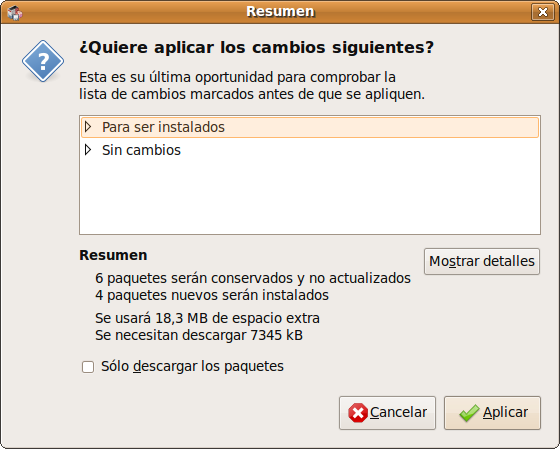 Obtenemos la ventana de confirmación con un resumen del tamaño de la descarga y los paquetes afectados por la instalación. Pulsamos sobre Aplicar y, al finalizar Synaptic tendremos el componente Base accesible bajo el menú Aplicaciones -> Oficina -> OpenOffice.org Bases de datos