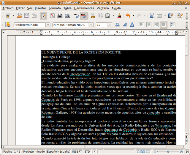 Vamos al menú Editar -> Seleccionar todo, o bien utilizamos la combinación de teclas Ctrl + E. Verá entonces como todo el texto del documento aparece en blanco con fondo negro, lo que se conoce como vídeo inverso.