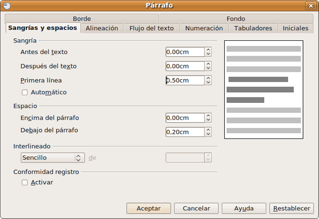 Es costumbre que la primera línea de cada párrafo comience un poco después que el resto para resaltar visualmente que se trata de un párrafo distinto del anterior, es lo que se conoce con el nombre de sangría de primera línea. Existen varias formas de hacer esto, la que se nos antoja más sencilla es la siguiente: