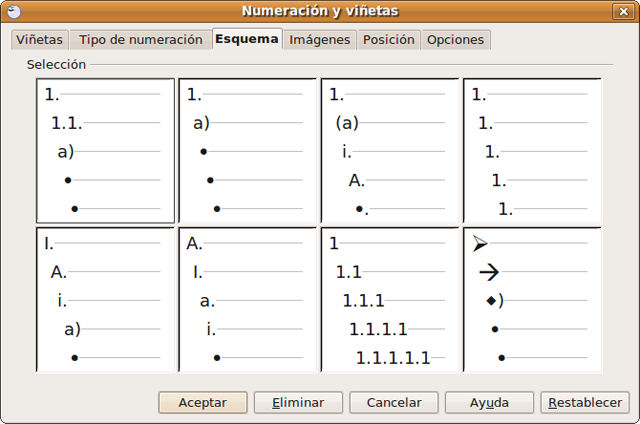 Vamos al menú Formato-> Numeración y Viñetas, y hacemos clic en la pestaña Esquema. De entre los tipos de esquema posible hacemos clic en el tercero de la última fila, Numérico con todos los subniveles, y pulsamos Aceptar.