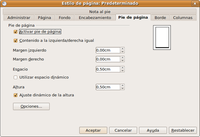 Vamos al menú Formato - > Página, pulsamos en la pestaña “Pie de página” y marcamos la opción Activar pie de pagina. Veremos entonces cómo al pie de la página aparece un recuadro en gris. Todo lo que insertemos aquí será automáticamente añadido al final de cada página del documento.