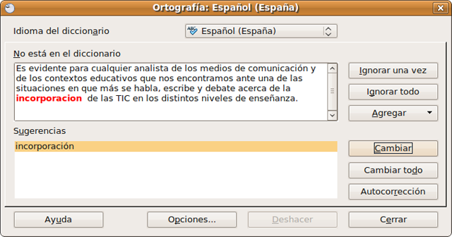 - Aceptar algunas de las sugerencias. Para esto seleccionamos uno de los términos sugeridos y pulsamos el botón “Cambiar” para modificarlo sólo para la ocurrencia actual o “Cambiar todo” para modificarlo en todas sus ocurrencias a lo largo del documento.